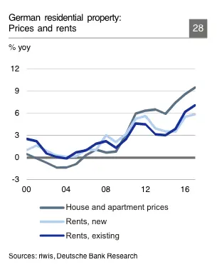 מחירי הדירות והדירות בגרמניה עלו מתחילת שנת 2007 וב-2009, מה שאומר ש -2018 היא השנה העשירית במחזור הנדל"ן הנוכחי. למרות שהמחזור כבר הגיע לאורך מרשים, הוא עדיין מאופיין במצוקת דיור והיצע יחסית קשיח. ההערכה של דויטשה בנק היא כגרמניה יש מחסור של למעלה ממיליון יחידות דיור. שימו לב למספרים הבאים: מחירי הדיור באזורים העירוניים הגדולים (מינכן, פרנקפורט, דילסלדורף, שטוטגרט) עלו ב-80% בין 2009 ל 2017. המחירים בערים קטנות יותר כדוגמת לייפציג עלו ב-60%.